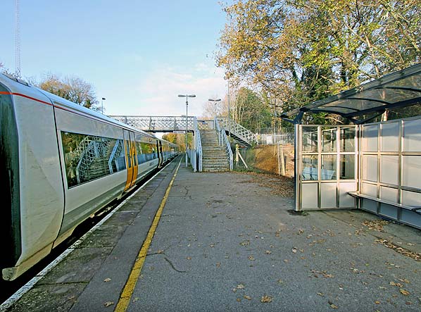A Hastings train waits in the down platform at Crowhurst station in November 2013. This view is looking north-west from the site of the down side building. Photo by Nick Catford