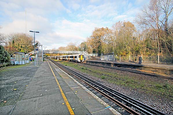 Crowhurst station looking north-west from platform 1 as a class 375 'Electrostar' EMU bound for Hastings pulls into platform 2 in November 2013. Photo by Nick Catford
