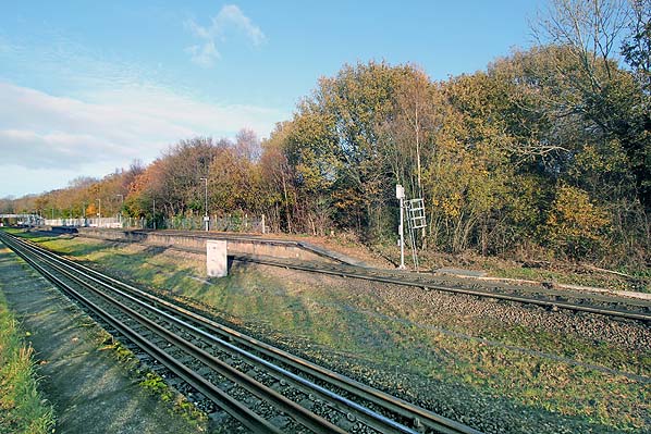 The east end of the down platform at Crowhurst station in November 2013. The trackbed of the bay line is overgrown with trees and bushes. Photo by Nick Catford