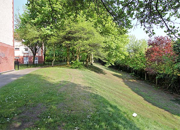 ![]() Looking east along the embankment on the south side of the line in April 2011. A siding running behind the down platform ran close to the edge of the embankment. The housing on the left covers the site of the goods yard and the west end of the station. A narrow strip of land has been retained as a footpath along the southern boundary of the station site. Most of the station site is lost under residential and retail development.