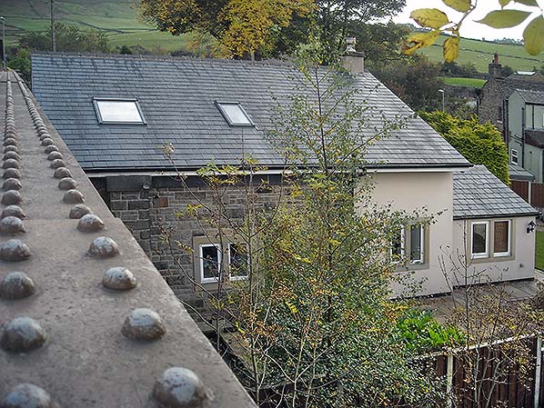 Looking south-east from Station Road bridge, Diggle, this modern stone-built house is on, or very close to the site of, the station’s former booking hall which straddled a siding behind the up fast platform. The back of No.1 Station Cottages is on the extreme right.