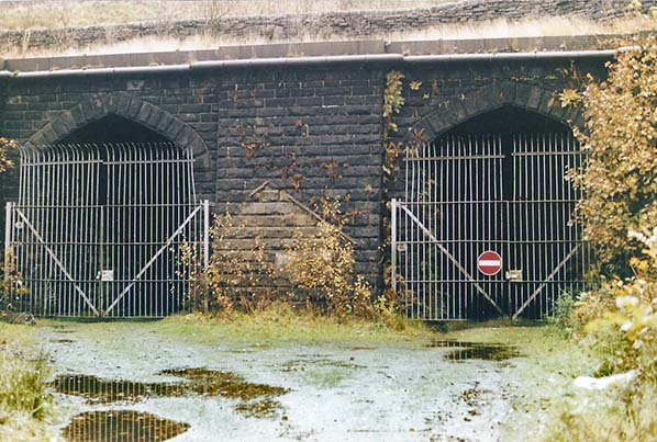 The two single-track Standedge Tunnels, looking north-east from the site of Diggle station in 1992. The earliest Standedge railway tunnel is immediately right of the water tank, carrying a single track; it opened in 1849 and was known by railwaymen as the ‘Nicholson Tunnel’. Its profile is straight sidewalls with arch. To its right is the ‘Nelson Tunnel’, opened in 1871 and of the same profile as its neighbour. Both tunnels closed in 1966, since when all traffic has used the newer double-track tunnel.