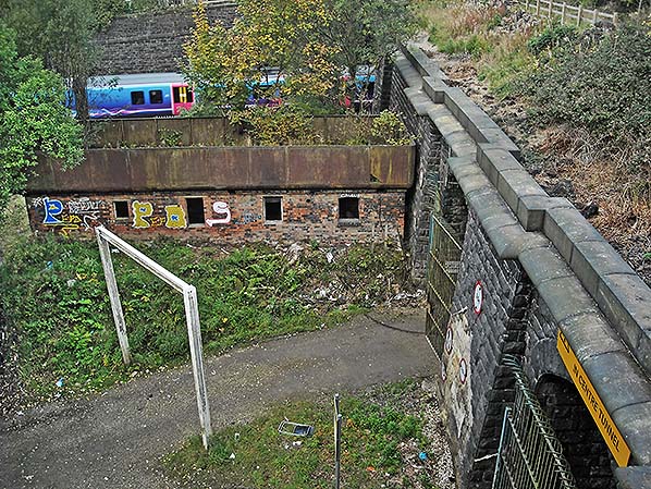 The Standedge Tunnels’ portals at Diggle are seen in October 2015, looking north-west. The closest tunnel mouth is that of the Nelson Tunnel (1871) and immediately beyond is the Nicholson Tunnel (1849). The tank used to supply water for the troughs in the tunnels, but now it is colonised by trees, while graffiti artists of restricted talent have left their mark on the red-brick base. In the background a DMU is emerging from Standedge North Tunnel.