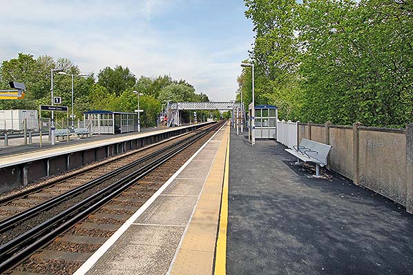 ![]() Looking north along the down platform at Dunton Green station in April 2014. The main station building was on the left. The trees on the left are on the course of the Westerham branch.