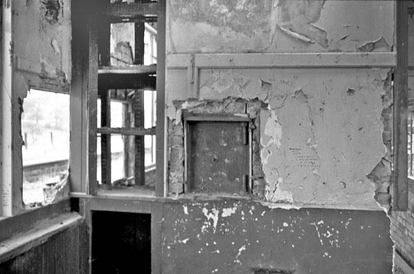 ![]() Earby station - Inside the booking office looking towards the booking window, in October 1975; note the safe in the wall