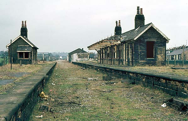 Looking south from the island platform at Earby station in April 1976. At this time all the station and goods yard buildings were intact but derelict and vandalised.