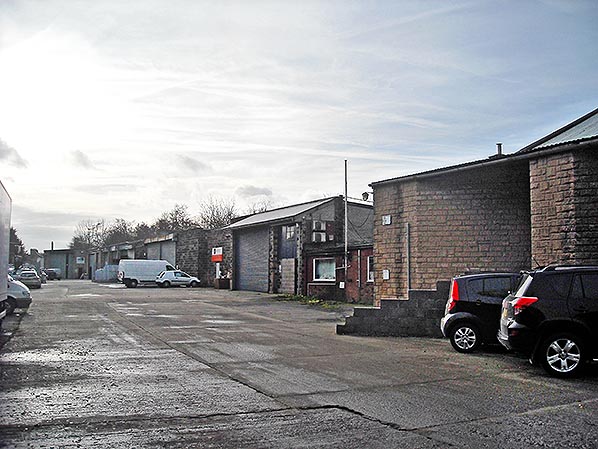 ![]() The site of the former goods sidings stretching from Earby passenger station (ahead, but demolished) to the goods shed (roof seen extreme right) is now occupied by the small Station Yard industrial estate. The view is southward in November 2014.