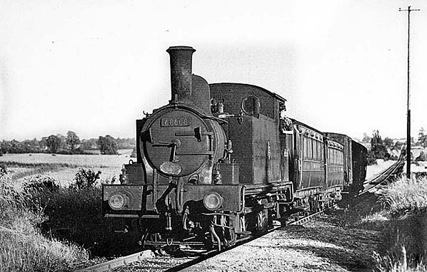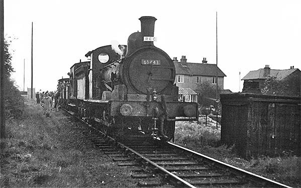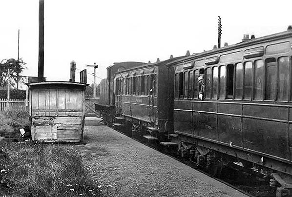 ![]() In August 1950 a Kelvedon-bound train pauses at Feering Halt. The passenger vehicles are E62262 and E60461. The impression is gained of the photographer being known to the chap looking out of the carriage; perhaps they were travelling together and the photographer hopped off to take the photograph. There would have been plenty of time as the level crossing gates are still closed to the railway. The fireman would leave the locomotive to open the gates on what until 1967 was the A12 road, the train would draw forward over the crossing and the guard would dismount and close the gates. We are looking at what was the drivers' end of the former omnibus body and by this time the screens either side of the driving position had disappeared - they had literally fallen off.