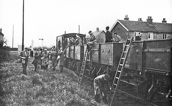 Photo from William Boyle collection ![]() Another view of the Railway Enthusiasts Club open wagon railtour of 6 April 1957 at the remains of Feering Halt. On the right stands a permanent way hut, several of which were positioned along the line as was normal practice everywhere at one time. Linesmen (or Platelayers) had their own sections of track which they patrolled, making adjustments and minor repairs as necessary. The Kelvedon & Tollesbury also had a Wickham motor trolley, kept in a shed at Tiptree.