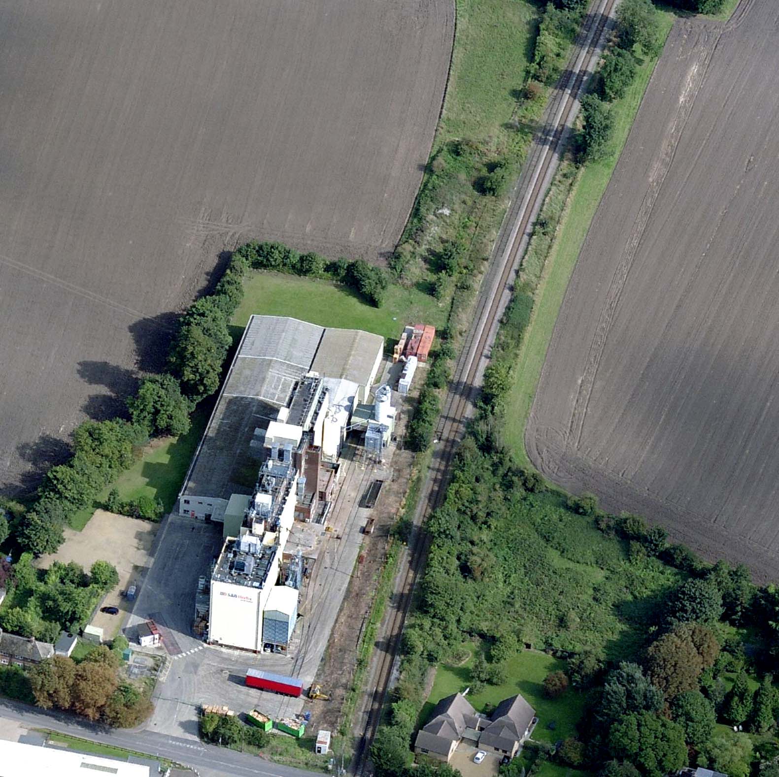 Aerial view of Fulbourne station c 2010. The sidings that were laid into the grain silo during WW2 can still be seen embedded in the concrete in front of the building. To the east (top of picture) the siding can be followed to its junction with the down main line. 400 yards of the down line was retained after the line was singled in the 1980. Although the line is still in situ there is no longer a physical connection with the former up line which is still in use. The original WW2 building was refurbished in 1986 and is now owned by S&B