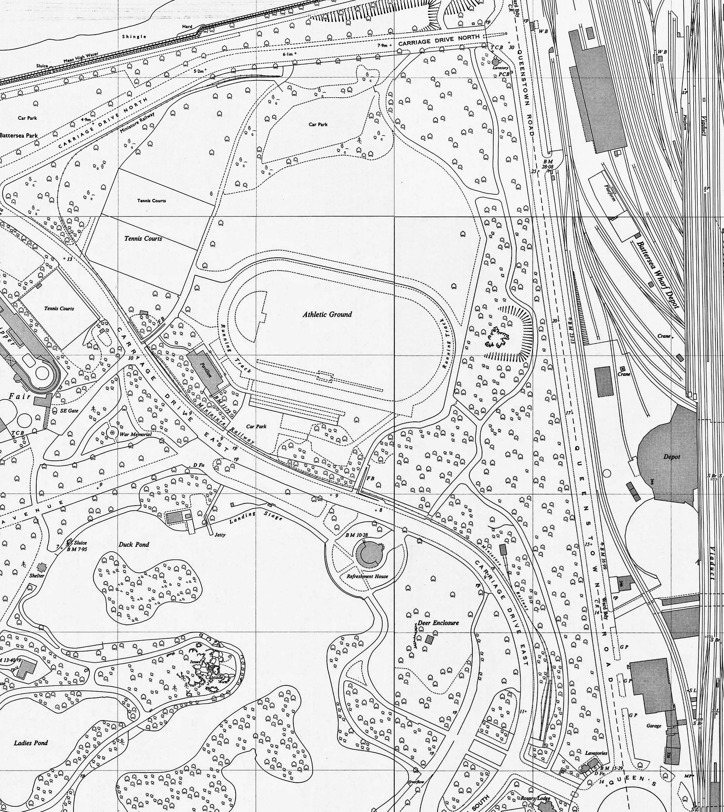 1960 1:1,250 OS map show the line running to the east of Carriage Drive East before turning west to the Chelsea Bridge terminus on the south side of Carriage Drive North. There was an intermediate station to the west of The Pavilion. A two road engine shed is seen to the north of the southern terminus at Queenstown Road. Click here to see a larger version of the map.