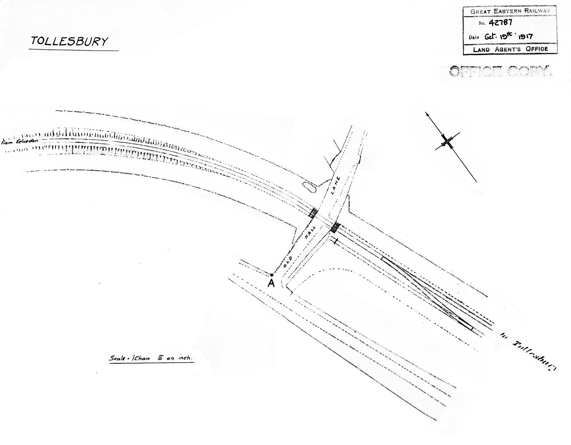 GER Great Eastern Railway plan from 1917 of Old Hall Lane level crossing. between Tolleshunt D'Arcy and Tollesbury. The location is about half a mile from Tollesbury station at lower right. The shaded areas either side of the level crossing represent cattle guards, the crossing being one of several open (ungated) crossings on the line. Old Hall Siding is partially shown on the right. With the exception of Threshelfords Farm, Wilkin's jam factory and Tudwick Road all these remote wayside sidings away from Kelvedon were double-ended, in other words loop sidings. Click here for a larger view.