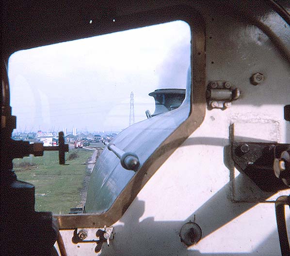 The view ahead from the footplate of Army No.62 as she approaches the Port Gate main road in February 1976. This view shows well the restricted forward vision offered by steam locomotives, especially tank locomotives, and which was perpetuated with certain early mainline diesel locomotives. Directly ahead of the camera is Marchwood's red-painted Green Goddess fire tender. These vehicles are described briefly on the Port Gate page. In the left background can be seen the funnel of Union Castle Line's vessel 'Edinburgh Castle', berthed at Southampton.
