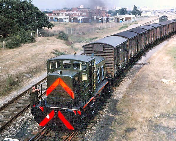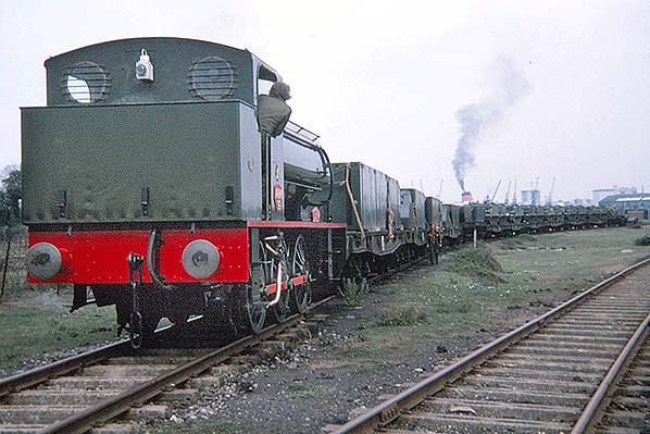 Ruston Army No.432 heads a train of short wheelbase vans from the port to the exchange sidings in August 1977. The vans would have arrived at the port from the main line loaded, the photographer suggests, with ammunition. Mulberry Halt is behind the photographer.