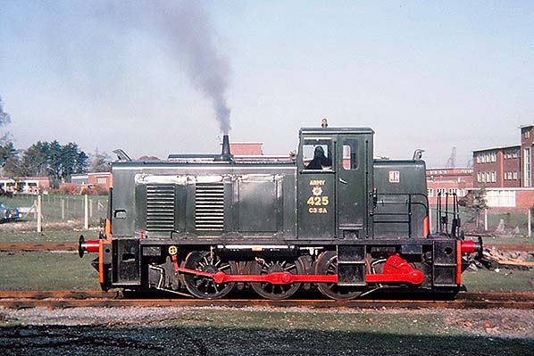 North British Army No.413 outside the locomotive shed at Marchwood in November 1975. In the background stands Ruston Army No.425. The 'C2 SA' on the cabside is the army