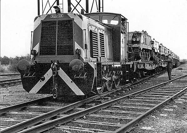 Ruston Army No.432 seen here in November 1975 at the exchange sidings. In the right background is a tracked vehicle of some description on a flat wagon while on the wagon coupled to the locomotive is what appears to be a compressor or perhaps a mobile generator.