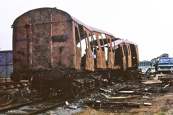 Of the two passenger coaches involved in the collision with North British Army No.413, one was written off. This was Army No.5305 which had begun life as BR London Midland Region No. M43269 and is seen here being scrapped at Marchwood in October 1977. It has been burned out; once a normal part of scrapping procedure done to get rid of wood, fabric and anything else with no scrap value so only metal is left. M43269 was a Brake Second suburban coach, the brake end being that