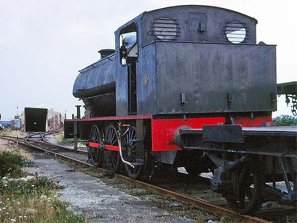 Army No.92 at the same location as the previous view but this time with the camera looking towards the locomotive shed (partly visible in the background). Glimpses of the shed's exterior could be seen in the film, while its interior was used to represent the interior of the tunnel and the robbers store. On the left the second tunnel mock-up can be seen. This 'tunnel' section was nothing more than a framework lined with black plastic sheeting and the whole covered by tarpaulins or similar. At the far end was a false wall with a hole cut in it and the hole can be seen in this view. The purpose of the hole was to give an impression of length to the tunnel and to this end was very effective. From this angle No.92 looks even dirtier than she did from the front. Modellers refer to this dirtying-up as 'weathering' but of course as far as No.92 was concerned it was full scale weathering. With one exception all these photographs of the set were taken, the photographer informs us, on a day in August 1977 when no filming was being undertaken. When it was, No.92 was in steam but obviously remained in the open air and the two fake tunnel sections used only for people shots. Anybody who has seen both the 1978 and 1996 screenings, the latter being filmed on the Tanfield Railway during 1995, will spot a number of differences and not least of which was the locomotive used in 1995, ex-NCB Ashington No.38, facing the opposite way around to No.92 relative to the tunnel mouth.