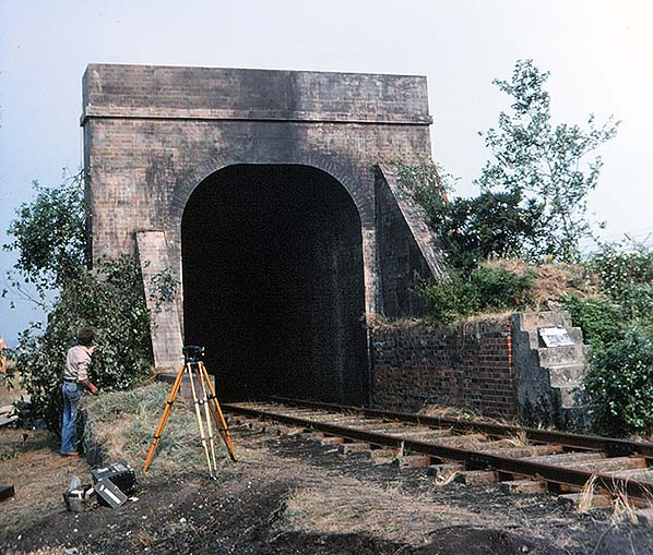 Mentioned together with a photograph in the Marchwood (Fawley Branch) pages is the production of the Southern Television adaption of the Enid Blyton novel 'Five Go Off to Camp', shot in 1977 and screened in 1978. To recap, the plot revolved around mysterious ghost trains supposedly seen operating on a stretch of disused railway through remote moorland and which transpired to be a train used by smugglers which, between smuggling duties, was hidden inside a tunnel. The location of the tunnel has always been the subject of much speculation and number of somewhat wild suggestions; in fact there was no tunnel in the true sense of the word, just a couple of reasonably convincing mock-ups erected on the Marchwood Military Railway. One giveaway, sharp-eyed viewers may have noticed, was the military-style railway track which although not unique to MoD Marchwood would be a clue to the filming taking place on a military railway. There were two 'tunnels' erected at Marchwood, one at the coaling stage for external shots and another near the locomotive shed for 'in tunnel' shots. This view shows the mock-up tunnel entrance for external shots built at the coaling stage, part of which is visible on the right. The 'tunnel' was only around six feet long and when bearing this in mind the darkness within the 'tunnel' was quite realistic. Less realistic was the complete lack of any hill behind the 'tunnel' mouth but skills of the cameraman and editors plus the deliberate planting of foliage would have ensured the illusion was at least passable. Film production also relies to a degree upon the assumption that the majority of viewers, of whom most would have been children in this case, will be focused upon things other than 'rivet counter' details. This and the following views of the film set(s) were taken
