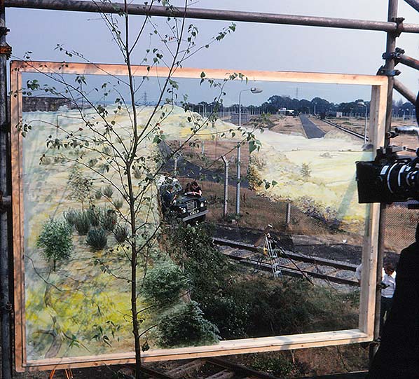 This view is at first glance rather confusing. It is taken from a scaffold tower erected for filming purposes and what we are seeing is a framed sheet of glass with a not-too-convincing moorland scene painted onto part of it and used to block out the unwanted background. The camera would be carefully positioned to line-up the scenery with the fake tunnel, which is behind the Land Rover; a Series III vehicle in civilian form and presumably belonging to the film crew. In the right background and seen mainly through the unpainted area of glass is Roberts Camp. Plans and aerial photographs show two sidings serving this location but close examination of a much larger version of this photograph appears to show three. One can clearly be seen right of and parallel to the roadway while another, largely hidden by grass, is to the left of the roadway. In the background, again left of the roadway, are a number of vans stabled side by side suggesting the aforementioned total of three sidings. As an aside and to avoid any possible confusion it is worth mentioning that a remake of Five Go Off to Camp was filmed in 1995 and screened in 1996. This adaption was filmed on the Tanfield Railway and the locomotive used was ex-NCB Ashington Colliery Austerity 0-6-0ST No.38 (RSH 7763/54) complete with electric headlamp. The 'tunnel' was actually the overbridge at Andrews House and the shots supposedly inside the 'tunnel' were taken inside Marley Hill shed.