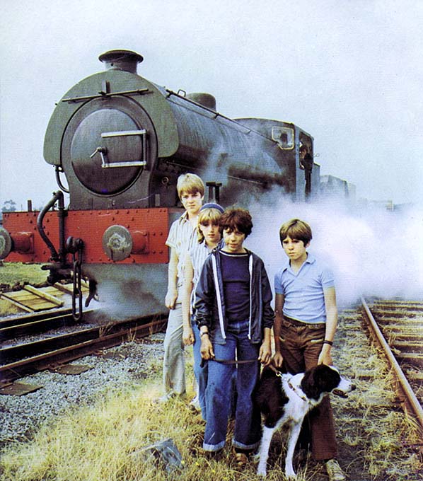 This view from August 1977, is a publicity shot and shows the lead cast of Five Go Off to Camp posing in front of in-steam Austerity Army No.92. From left to right and with character names in brackets are; Gary Russell (Dick); Jennifer Thanisch (Anne); Michele Galagher (George); Marcus Harris (Julian). In the foreground is Toddy (Timmy [The Dog]). Sadly Michele Galagher is no longer with us, having passed away, reportedly suicide, during 2000 aged just 35 (Date source: IMDb). Her surname is spelled variously as 'Galagher' or 'Gallagher' and it would appear the former was her stage name and the latter her birth name. She is in addition sometimes referred to as 'the girl who wanted to be a boy'. Given the age of these actors at the time (they were classed as 'Child Actors') this could well have been the first time any of them had been in close proximity to a working steam locomotive. The 1978 airing was produced for what was then Southern Television by Portman Productions who went on to produce the 1996 airing for what was then Tyne Tees Television. As of 2016 Gary Russell is with Planet 55 Studios in Australia, Jennifer Thanisch is in the teaching profession, Marcus Harris is still in sporadic acting and has also been Deputy Mayor of Wallingford among other things. Toddy, a Border Collie, died shortly after filming of the series was completed.
