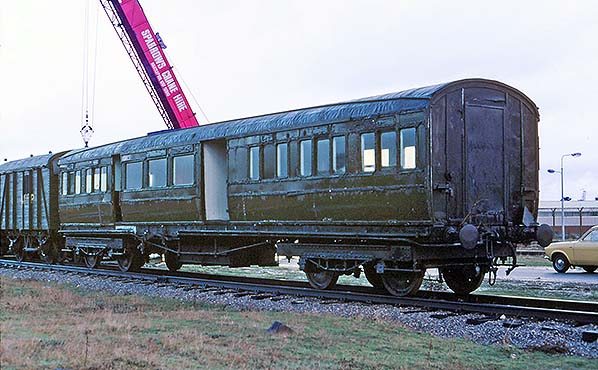 This photograph, again from December 1978, offers a full view of the other two vehicles which accompanied LSWR No.70 to the Mid Hants Railway (MHR). The van is an ex-Southern Railway Diagram 1458 12t box van which had come to Marchwood from Longmoor in 1967. Built in 1940 it had been Southern Railway No.49741 but whether it ever carried this number before being taken over by the military is unclear. It ended up under the military as AD 47777. Heavily modified by the military, its double doors on both sides had been removed and the openings planked over while a door was fitted into one end over a buffer. At Marchwood the van ran with No.70 in connection with the diving school. Among the identifying features of these vans were the roof and the frame sections sloping inwards from the bottom. The type was destined to become the most common 12t van in Britain and could be seen anywhere from Penzance to Wick while, during WWII at least, the design became the preference of the military. The photographer had some involvement with securing these vehicles for the MHR who agreed, at his suggestion, for the van to be labelled "Army Stores Longmoor to Marchwood" and it would appear the van ran so-labelled for a time. At first used as an office by the MHR the van was last restored, back to pre-military condition, in 2006 and runs from time to time in the railway's demonstration freight train. It is painted, at the time of writing, in non-fitted grey livery although it is through-piped. However, is it numbered S 47777 which is a peculiar mix of Southern and military but nevertheless a nice nod to its history. The carriage, seen here being lifted from its bogies is Army 3301 which began life as BR London Midland Region No.M46069. It was a 57ft BR MkI suburban Compartment Second seating 108 and when in military service had an observation window fitted centrally in one end and some internal alterations. At the MHR it was used as an office at Ropley but due to deteriorating condition (these coaches were prone to corrosion which spread from the areas below the windows) it was scrapped sometime in the early 1980s.