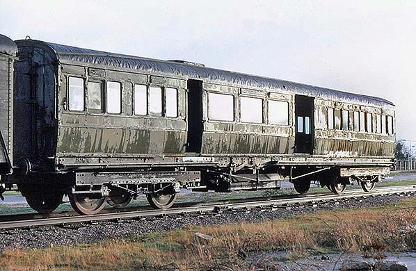 Another view of the ex-LSWR Restaurant Composite No.70, Army No.3321, in December 1978 during preparation for transporting to the Mid Hants Railway. A total of 23 of these vehicles were built and drawings of them in clerestory form have survived, enabling us to know their internal layout. Contrary to impressions given in this and accompanying photographs, No.70 did not finish up with a number of sealed doorways and the openings seen here were the original and only doorways excepting the gangway connections. On the opposite side were two single doorways, separated by panels, towards the far end. Nearest the camera is what was the First Class area which contained two bays; that nearest the corridor connection having 1 x 1 and 2 x 1 seating with the second bay having 2 x 1 and 2 x 1 seating, total 11 individual seats all with tables. At the far end of the vehicle the layout of the Third Class accommodation was similar apart from there being an additional 2 x 1 and 2 x 1 bay at the inner end and with the 4-seater sides of the two inner bays comprising two 2-seater bench type seats. This latter also applied to the innermost seating of the end bay. Total Third Class seating was 17, thus total seating for the entire vehicle was a mere 28 but this was fairly typical of these self contained vehicles for the time. There was an offset central corridor which moved to the side nearest the camera when passing around the kitchen area, behind the three wider window bays. The First Class end was accessed from the corridor via a sliding door but no such privacy was afforded the Third Class end. The central area contained a wash basin, pantry, stove, preparation table and various storage facilities including a bottle rack. The cooking area, which had a lead-covered floor, was separate from the pantry area and one could only be accessed from the other via the corridor and for this purpose two gates, as opposed to doors, were provided. The lead-covered floor would have been to prevent juices, oils, fat etc. damaging the wooden floorboards beneath. The use of lead for this purpose was once common; fish vans, for examples, were once lined internally in the same manner. How the stove was fired is not known. Also provided was a refrigerator but rather than being located in the pantry area it was in the corridor on the opposite side to the kitchen and pantry and behind the inner bulkhead of the Third Class area, space for it being found in the niche formed by the corridor moving from the side to the off-centre position. It is said the vehicles were given a clerestory roof due to the proximity of the seating areas to the kitchen, in other words for ventilation purposes which in any event was the main purpose of a clerestory roof anyway. When the Southern converted the vehicles to arced roof, some form of kitchen ventilation would need to have been provided and this is possibly what is visible on the roof in these views. That said and given that camera angles can be deceiving, the device on the roof appears to be above the former pantry area rather than the kitchen area. When in clerestory form, at least, the vehicles carried roof destination boards just above the cantrail. The inscription 'DINING SALOON' was carried on the waistline towards both ends and on both sides but the precise positioning varied per side for reasons of symmetry with other bodyside features.