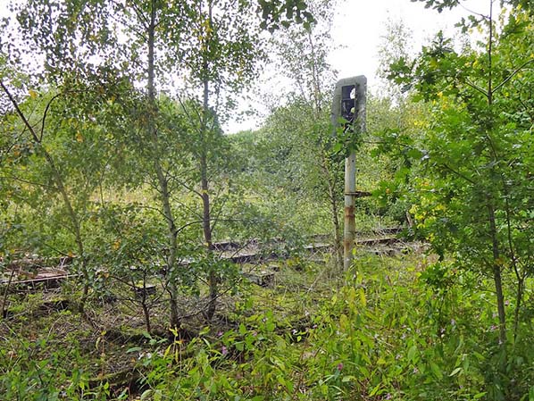 Hidden away surrounded by trees between Molly Wood Lane in the west and the East Lancs line at Rose Grove stands the eery sight of the remains of signal PN386. This signal was a replacement for the old semaphore signal that guarded the entry into Rose Grove from the loop line. This replacement signal was brought in around September 1973 and was a three aspect one, meaning three lights. The top one was green (for clear or go), the middle was yellow (proceed with caution), and the bottom one was red for stop. Half way down the post is a metal ledge, on this a route indicator light sat. During 1973 East Lancashire was resignalled with electrics and they were controlled at Preston's PSB (Power Signal Box). Here we are looking west with Rose Grove behind us, further down the hill towards Padiham was an old yellow distant semaphore signal 520 yards away which survived to the end. Directly behind us are a set of points, one connected the Rose Grove up goods line to enable trains to come down the line going west (signals PN384 & PN385), the other connected to the down goods line for trains coming up to Rose Grove from the loop line travelling east.