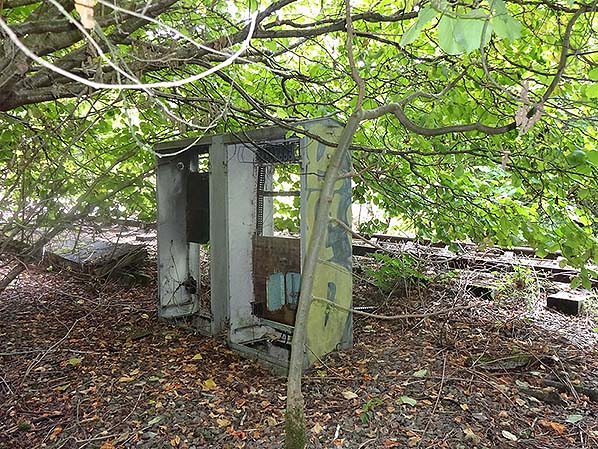 Two old and empty electric cabinets that housed some equipment either for the signal PN386 or possibly for the control of the points onto the down goods line at Rose Grove. The cabinets are next to the old rusty rails of the up line. We are heading west now towards Padiham on 30 September 2018.