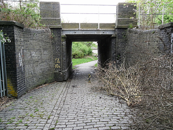 Going eastwards from Widnes No.7 the deviation line climbs at 1/150 towards the location of the St Helens line passing over Alforde Street on a small bridge after which there is a short section of embankment followed by a six arch viaduct. The route of the St Helens line between Ann Street crossing and towards Widnes No.7 has since the mid 1990s been occupied by a road (Watkinson Way). As the road is a dual carriageway the original bridge was demolished and replaced by a wider structure. |