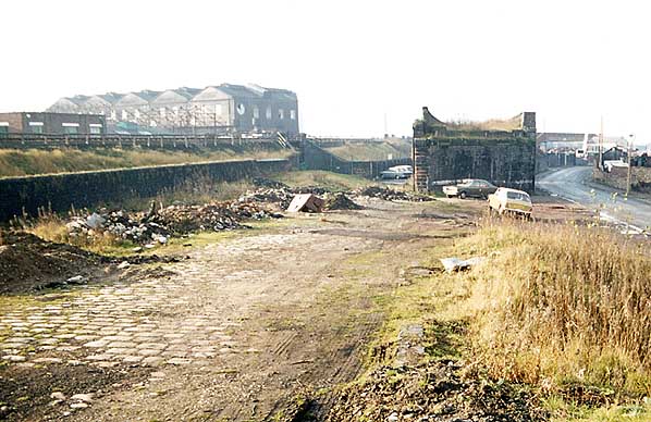Looking west along the course of the Great Central & Midland Joint Railway Widnes Branch (GC&MR Joint) railway in November 1975. The deviation line is seen to the left and Anne Street East to the right. The area of stone setts seen in the centre of the view had been part of van access road to Tanhouse Goods Yard. The LNWR deviation and the GC&MR Joint came very close to each other at this point by in the period when the latter was open as a through route there was no connection between them. In distance to right can be seen Widnes No.2 signal box which was on the St Helens line.
