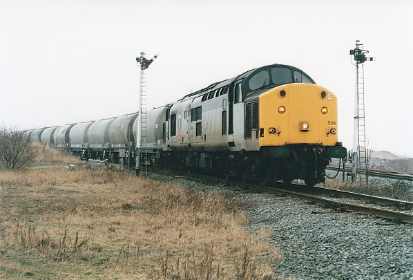 A train of cement wagons is seen pulling out of Tanhouse Yard and and heading west along the deviation line on 16 January 1997.