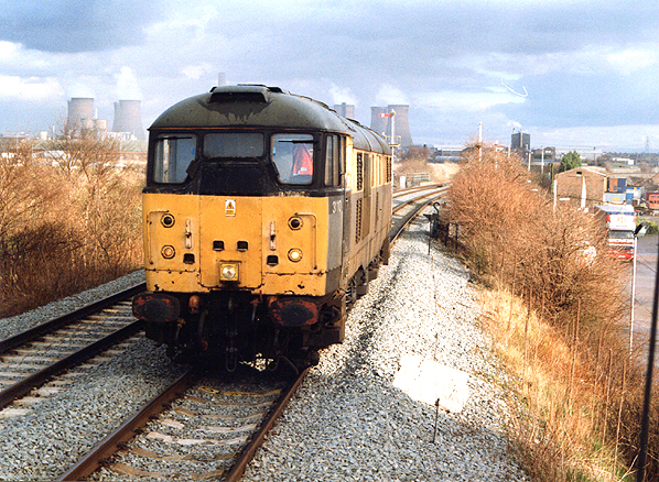 On 20 January 1999 a class 31 locomotive stands at a signal on the deviation line just to the east of the point at which the line had crossed over the St Helens railway. In the distance can be seen Fiddlers Ferry Power Station.
