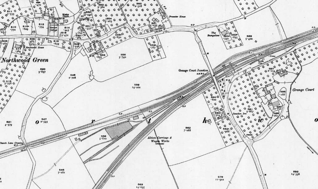 ![]() The OS 1:2,500 revision of 1922 shows a few changes. Northwood Green is showing signs of becoming more populous and Frocester House now stands where the original Junction Inn once stood. If maps are to be relied upon (it is not always so with revisions) the former inn became Frocester House. The second Junction Inn can be seen on the west side of Grange Court Road, south of the railway where it remains today.