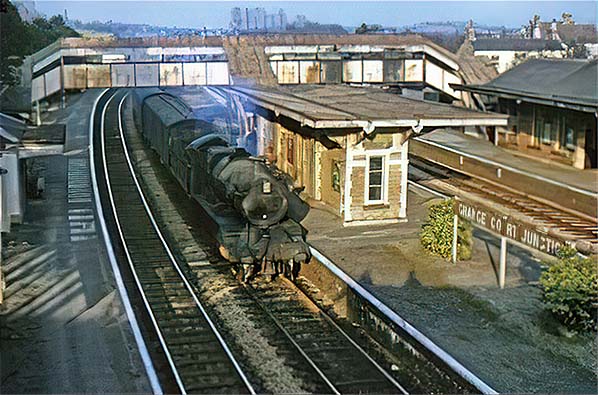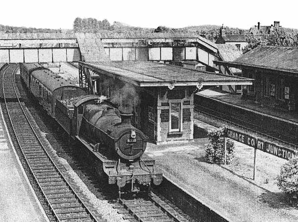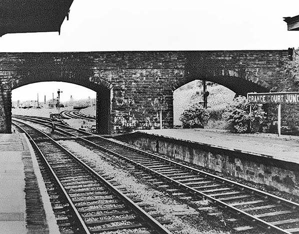 Photo from obsolete Grange Court Junction web site (2004 - 2012) ![]() Facing west from the Up Hereford platform circa 1960. As in other photographs, smoke stains on the footbridge above the Hereford tracks are conspicuous by their absence. The reason was the majority of trains on the Hereford line would pass beneath the footbridge with their regulators closed, unlike on the South Wales line, left, on which most trains, many of which were carrying coal and ore, thundered through without stopping. Towards the left end of the footbridge can be seen the banner repeater signals installed sometime around 1947. One feature this view shows and which is not evident in photographs from other angles is the 'dogleg' curve of the Hereford tracks at the west end on the station.