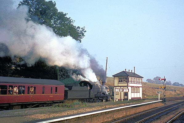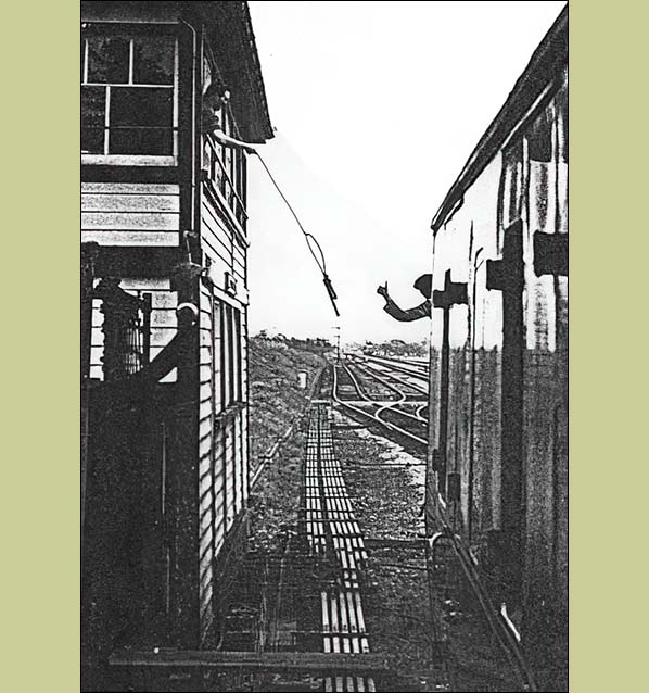 Photo by John Wiltshire from Peter Brabham's Flickr photostream ![]() As a train from Hereford departs Grange Court we get a glimpse of the method used by the signalmen to collect the single line token from Longhope off the locomotive crews. At far left is a GWR net type tablet catcher which appears from photographs to have not been in situ for very long and rarely used. The locomotive is out of sight due to already being on the curve connecting into the Up main line, the third track from the left, the first two being sidings. The date is 24 April 1964.