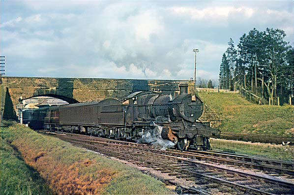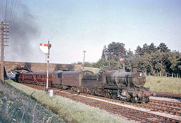 Photo from obsolete Grange Court Junction web site (2004 - 2012) ![]() On 2 June 1962 Churchward 4300 Class 2-6-0 No. 6330 was caught by the camera with a Hereford train. This locomotive had just over three months left in service, being scrapped at John Cashmore's Newport yard soon afterwards. Cashmore had a reputation for scrapping locomotives fairly quickly after arrival. The company was one of many which took advantage of the mass ridding of steam by British Railways during the 1960s. It also dealt with quantities of diesel locomotives which were withdrawn in the late 1960s at its various yards, with Newport seeing off numerous diesel shunters and North British Type 2 main line locomotives. On the subject of diesels, the Gloucester - Hereford services was predominantly steam until the end although diesels did make appearances, most notably 'Hymeks' but photographs of them are rare such was the enthusiasts' obsession with steam during its final years.