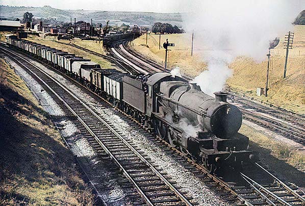 Photo from obsolete Grange Court Junction web site (2004 - 2012) Photo from obsolete Grange Court Junction web site (2004 - 2012) ![]() In about 1962 a short coal train approaches Grange Court on the Up South Wales line. The locomotive cannot be identified either by name or number. In the far centre background it is just possible to make out Church Lane level crossing and its keeper's cottage, the latter being still in existence today.