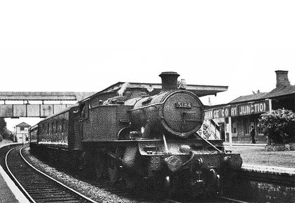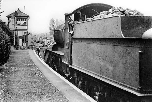 Photo from Jim Lake collection ![]() On an unknown date but probably around 1960 going by the apparently recently whitewashed platform edge an unidentifiable 4300 Class 2-6-0 is ready to depart with a train from the Hereford line. The track crossing the running line ahead of the locomotive led to the Up side sidings, the points from the Down Main to Down Hereford line being hidden from view by the locomotive. The tender has a near full load of coal, perhaps indicative of the relatively easy amble along the line from Hereford with light trains. The fireman is looking down at the hose dangling from the footplate. The suggestion is the footplate has just been hosed down and the hose is being dangled to let it drain itself. This was done routinely to rid the footplate of coal dust although Grange Court station may seem an odd place at which to do this, especially to a passenger train with limited station dwell time. The locomotive may therefore have been working a goods train and with time to spare.