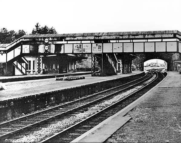 Photo from obsolete Grange Court Junction web site (2004 - 2012) ![]() A view facing west from the Down South Wales platform circa 1961. Until 1896 the camera would have been looking directly at the original West signal box. In front of the central bridge pier and barely visible is a sign informing passengers they must not cross the line at that point. These signs abounded at Grange Court but should anybody be unable to use the footbridge, such as if in a wheelchair or pushing a perambulator, a member of station staff, having checked signals to ensure no train was approaching, would escort such persons over one of the barrow crossings such as that seen here at the end of the platforms..