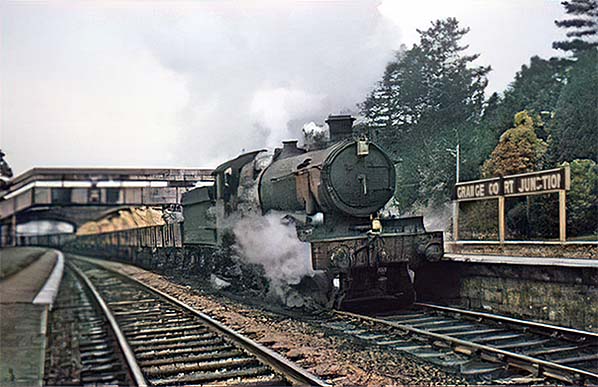An eastbound goods train passes Grange Court in October 1964 with some wagons apparently loaded with timber. The locomotive, which is unidentified, looks to be in appalling condition. It is missing its smokebox numberplate which suggests withdrawal was imminent or it had been withdrawn and then temporarily reinstated. Scenes like this were not uncommon as the steam era drew to a close. Steam on the Western Region ended over the winter of 1965/6 apart from two Pannier Tanks at Croes Newydd shed which lasted until July 1966 although by that time Croes Newydd (Wrexham) had become a London Midland Region shed.