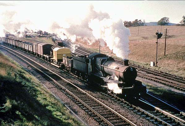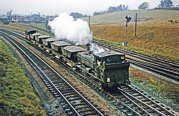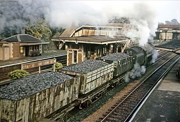 In October 1964 a BR Standard Class 9F 2-10-0 rumbles through Grange Court with an eastbound train of coke. Coke is produced from Coking Coal which is baked (hence 'coke ovens') in an oxygen-less environment and burns cleaner and hotter than coal. It is used in blast furnaces, forges, certain types of stove and in the dim and distant past was the fuel for early British locomotives. Coke is lighter than coal by volume, therefore railway wagons could carry greater volumes of coke than coal, the reason why coke wagons were larger in terms of height and as seen here were very distinctive in appearance.