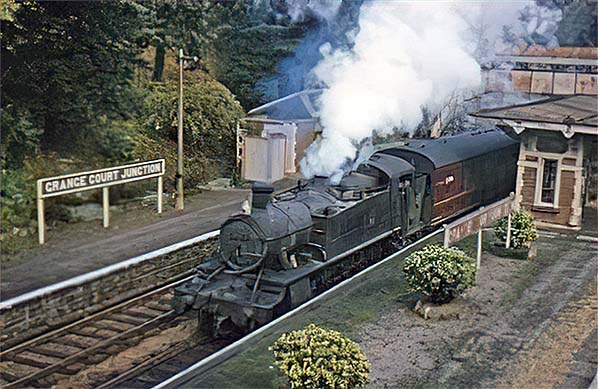 In this scene looking towards Oakle Street and Gloucester two Hereford line trains are about to cross. Both are hauled by 'Large Prairie' 2-6-2T locomotives, that of the ex Hereford train running bunker first. On the right, the goods yard is out of use having closed on 12 August 1963 so the photograph will date from sometime in the final year of the life of both the station and the Hereford line. A check of the final timetable for the Hereford line suggests the trains are the 14:25 ex Gloucester and the 13:40 ex Hereford. Departure time from Grange court was 14:38 and 14:36 respectively and indeed the ex Hereford train does appear to be departing. If these trains have been correctly identified the period will be between 7 September 1964 and 31 October 1964. To the left, the winching equipment for the 'Challow' lamps can be seen marginally more clearly near the bottom of the lamp post than in other photographs. During daylight hours the lamps would be lowered, removed and taken to the lamp room for refilling with paraffin and for any other maintenance which may be required. Shortly before dusk the lamps would be fired up and winched back to the top of the lamp posts. One wonders if the motor car in the goods yard belonged to the photographer.