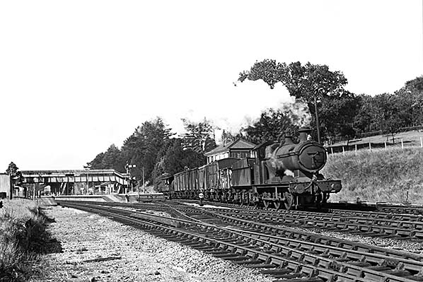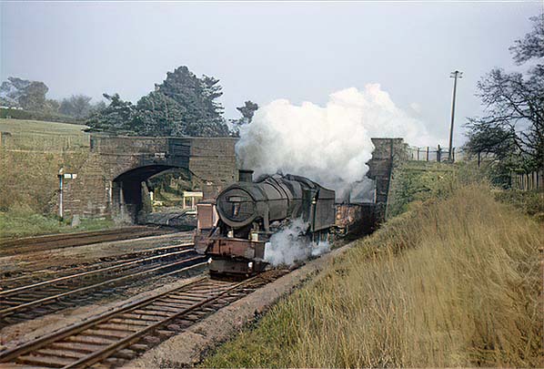 In August 1964 Collett 2251 Class 0-6-0 No. 2287 shuffles away towards Gloucester with a Class 8 goods working. At this time Class 8 covered a variety of traffics, as indicated here by the various types of wagon, but not fitted with the automatic brake and restricted to 35mph maximum speed. A look at the complex Working Timetable for this period shows the Hereford branch goods departed Gloucester New Yard at 5am and did not reach Hereford until some four hours later. The single line between Grange Court and Rotherwas Junction (Hereford) was worked by Electric Train Token. Points to sidings at Blaisdon, Backney, Ballingham and Holme Lacy were unlocked by key attached to train token (more commonly referred to as 'Key attached to train staff'). There was in addition an intermediate token instrument at Holme Lacy North Ground Frame. As was common practice, especially on single track lines, the Hereford branch goods operated only in the Down direction until the line closed to passengers in November 1964. The implication is therefore that the train in this photograph has not come from Hereford but from the private siding west of the station. No. 2287 was a Hereford locomotive at this time and she would not necessarily work back to her home shed on that same day. She was transferred to Gloucester Horton Road shed in November 1964, this date being significant because not only did Grange Court close on 2 November 1964, along with the Gloucester - Hereford passenger service but Hereford shed also closed on that day. Withdrawal for No. 2287 apparently came on Friday 21 May 1965, an odd day of the week for a withdrawal, with other records showing during the four weeks ending 13 June 1965.