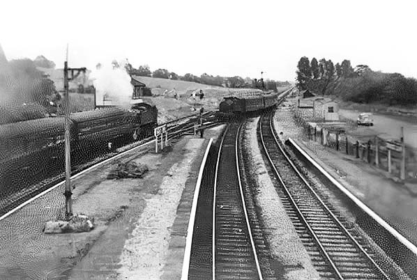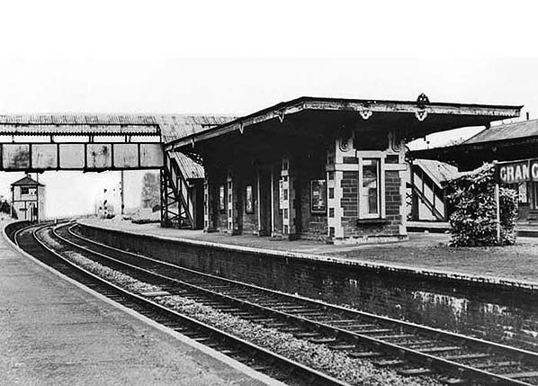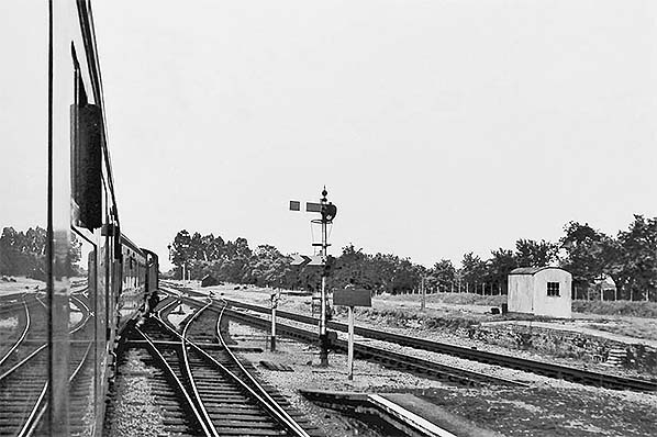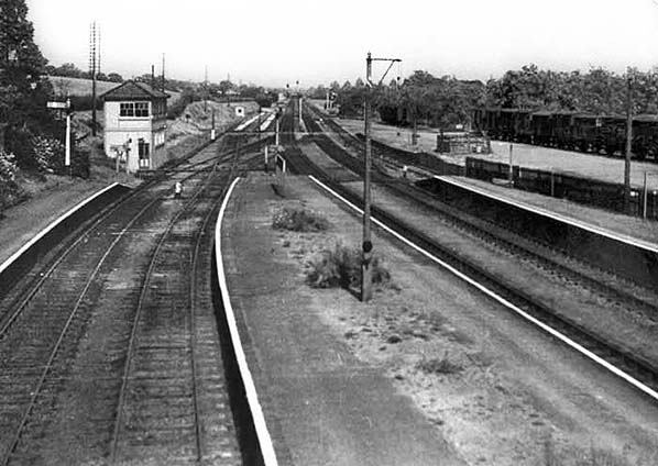 A view from the footbridge across the forlorn-looking eastern end of the station, the signal box being the smartest item on view. This photograph supposedly dates from 1964 but look carefully on the right and it will be seen the goods yard was still use. Goods traffic was withdrawn on 12 August 1963, excepting the private siding west of the station, so the date of this photograph is earlier than 1964. The platform edges have been repainted (actually whitewashed) and seemingly recently.