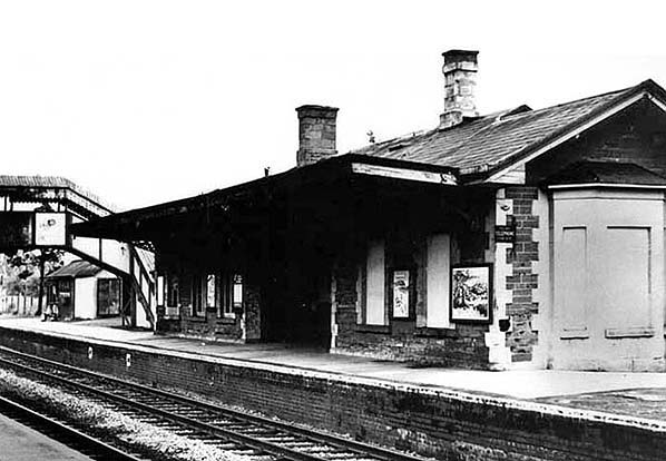 Photographed in October 1964, this is one of the relatively few close-up views of the main station building. It's dirty condition will be noted, one of the drawbacks of steam locomotives, as will the boarded-up windows on the nearest end of the building. The design is quite typical of GWR intermediate stations, including the bay window, and several such still exist but sometimes with orientation reversed to suit requirements of individual stations. The room behind the bay window is thought to have originally been a telegraph office. The small building seen in the left background is, at the time of writing, the only surviving structure of this former station.