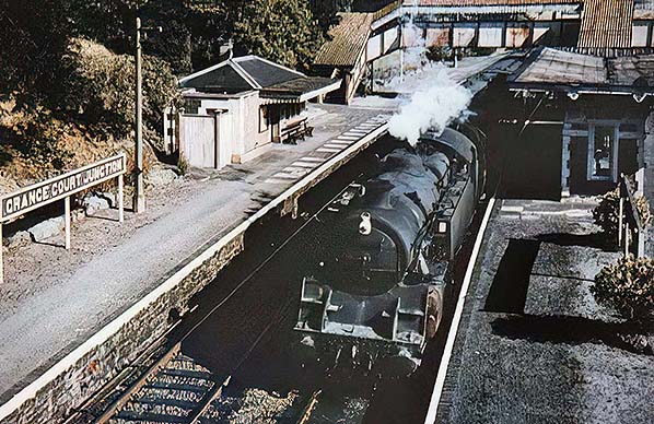 An unidentifiable BR Standard Class 4MT 2-6-4T pauses with a Hereford train, within a few months of closure. How these BR Standard locomotives came to be on this line is explained briefly in another caption. To add to that however, they would have replaced older locomotives being withdrawn but even so use of these then modern locomotives feels something of a waste on services such as this - ambling along with just three or four vehicles in tow. While the South Wales line did see diesel multiple-units, initially of the Swindon 79xxx series, they never did venture onto the Gloucester - Hereford services or at least not on a regular basis.