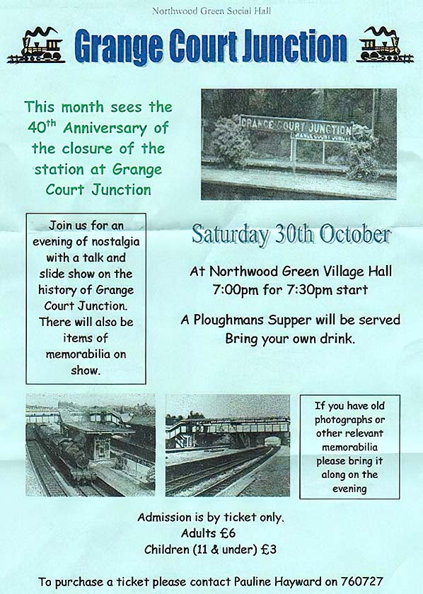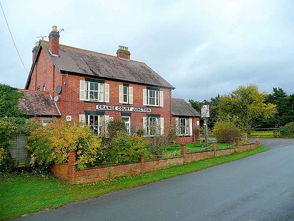 Photo by David Burrows from his Flickr photostream ![]() On 2 October 2005 a Class 150 DMU heads towards Gloucester through the site of Grange Court Junction station. The loop on the left did not appear to be used very often. It was roughly on the alignment of what was once the Up Hereford line and has been lifted since this photograph was taken. To the right of the DMU is the only surviving structure from the former station and to its right stands the former stationmaster's house. Further back on the right stands the house that is Grange Court, more specifically Grange Court Farm.