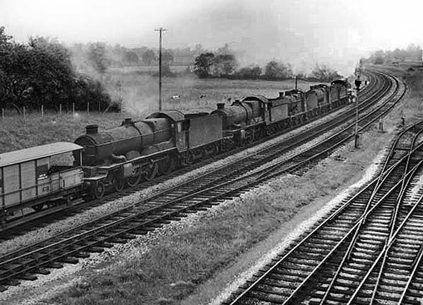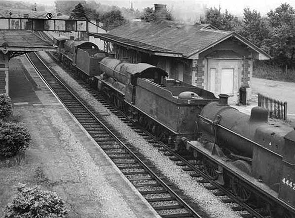 Photo by Graham Turner ![]() This is the second of three photographs of the train of withdrawn locomotives going for scrap as they passed through Grange Court on 10 August 1965. Out of view coupled behind No. 7816 hauling the train was Fowler 4F No. 44123 destined for Woodham's scrapyard at Barry from where she was eventually rescued for preservation. At the time of writing she was at the Avon Valley Railway awaiting restoration. Next and visible here was Fowler 4F No. 44422, another one destined for Woodham's and was also to survive into preservation, this time at the Churnet Valley Railway where she has steamed. Next was Castle Class No. 7034 Ince Castle, destined for the Bridgend scrapyard of Richard Hayes which she did not survive, being scrapped in October 1965. The final locomotive was Castle Class No. 7022 Hereford Castle and her fate was the same as that of No. 7034. The two Castles were by no means old, having been built at Swindon under British Railways. All of these locomotives including No. 7816 had come from Gloucester Horton Road shed.