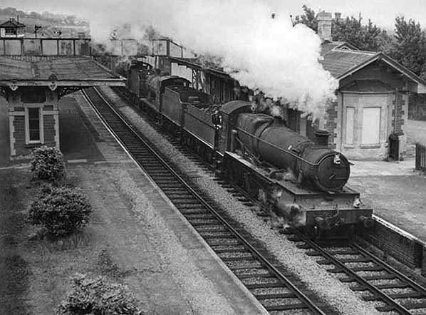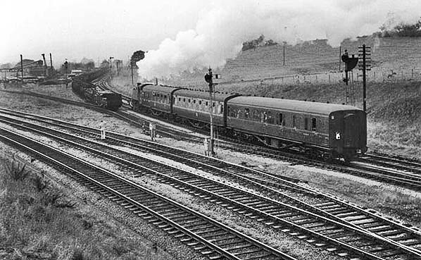 ![]() Station Name: GRANGE COURT JUNCTION[Source: Darren Kitson] ![]() On 23 October 1964 a BR Standard Class 9F 2-10-0 passes Grange Court on the Down South Wales line. The train appears to be loaded, perhaps with iron ore as the coal flow along this line was largely, if not entirely, in the opposite direction. Information with this photograph states the 9F was No. 92240 but it actually appears to be No. 92243. Checking allocations of the time the latter is far more likely. The 9F class was not introduced until 1954 and the number of years service some of them put in could be counted on one hand, such was the farce that was the BR Standard steam types. This was no reflection on the locomotives, rather it was British Railways' rather sudden haste to eliminate steam in favour of diesel traction as part of the 1955 Modernisation Programme. Very occasionally the 9Fs would appear on passenger trains and despite their small (5 feet) driving wheels were capable of reaching 90mph. This was all very exhilarating, the problem being only the first and fifth driving axles had full flanges. Axles two and four had reduced depth flanges while the centre wheelset was unflanged to help negotiate curves. Once the 'brass' heard about the high speeds they therefore quickly put a stop to it. Note the running-in board on the right announces only 'Grange Court'.